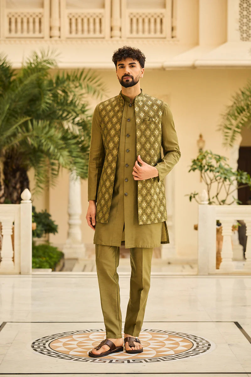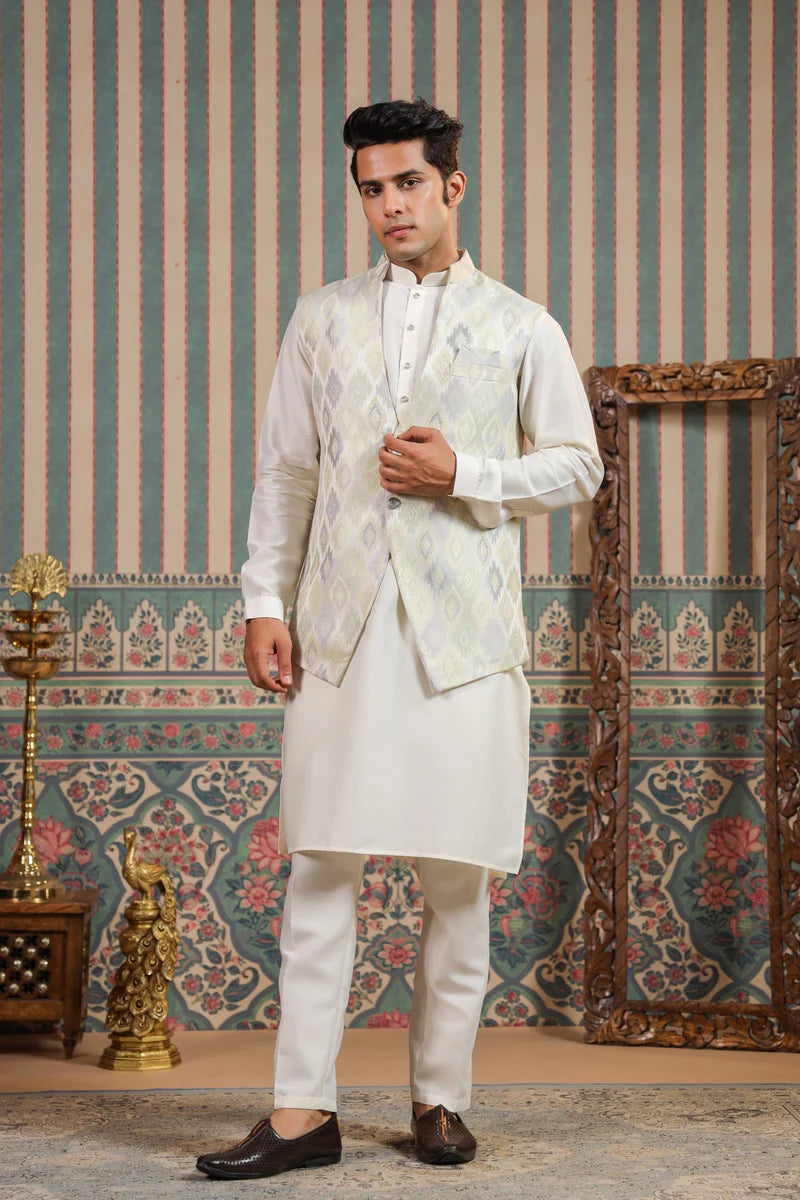 Elevate your formal attire with our Pista Color Jacquard Waistcoat for men. Immerse yourself in the rich texture of jacquard, paired with the soothing and lively hue of pista green. This ensemble adds a touch of regal elegance to your formal look, making it ideal for various occasions and special events